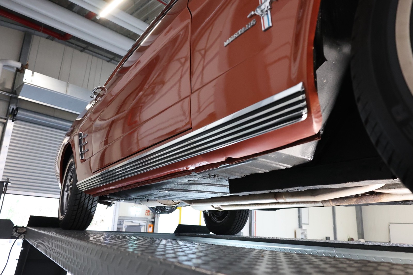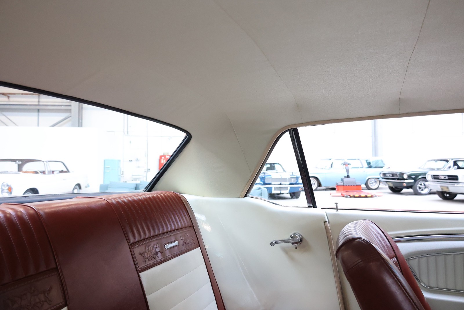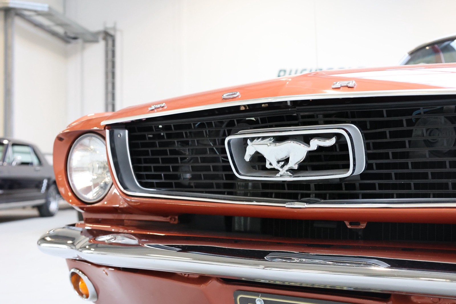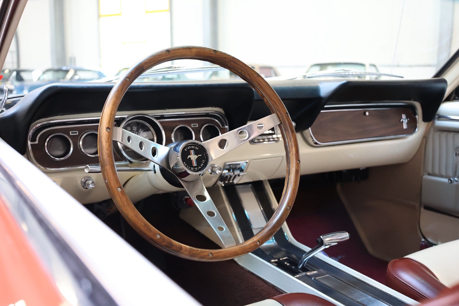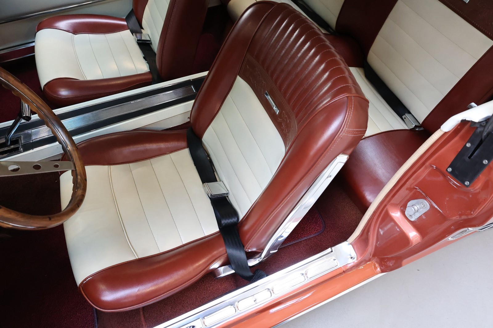 Sprechen wir gerne etwas mehr über die Blechbeschaffenheit dieses Ponys. Die Karosserie befindet sich einem sehr schönen und originalen Zustand. Die schöne Lackierung in Emberglow wurde vor etwa 10 Jahren neu gemacht, sie präsentiert sich mit viel Glanz und ist in einem ganz tollen Zustand. Original wurde das Pony in dieser Farbe ausgeliefert, die es auch nur 1966 für den Mustang in dieser Form gab. Oftmals werden Mustangs in anderen Farben umlackiert, schön ist es doch, wenn sich das Auto auch 60 Jahre später immer noch in der gleichen Farbe zeigt. Das schwarze Vinyldach befindet sich ist in einem tadellosen Zustand und weist keinerlei Rostprobleme auf. Die Innenausstattung ist im zweifarbigen Pony-Deluxe Interior gehalten, was sich farblich dem äußeren anschließt und zusätztlich noch in weiss gehalten ist. Also jetzt mal ehrlich, das sieht einfach richtig gut aus und passt mega gut zum Mustang. Auch eine Mittelkonsole sowie ein Holzlenkrad zieren den Innenraum, beides macht sich sehr gut und wird gerne gesehen. Zudem haben wir dem Pony einen neuen Dachhimmel spendiert.