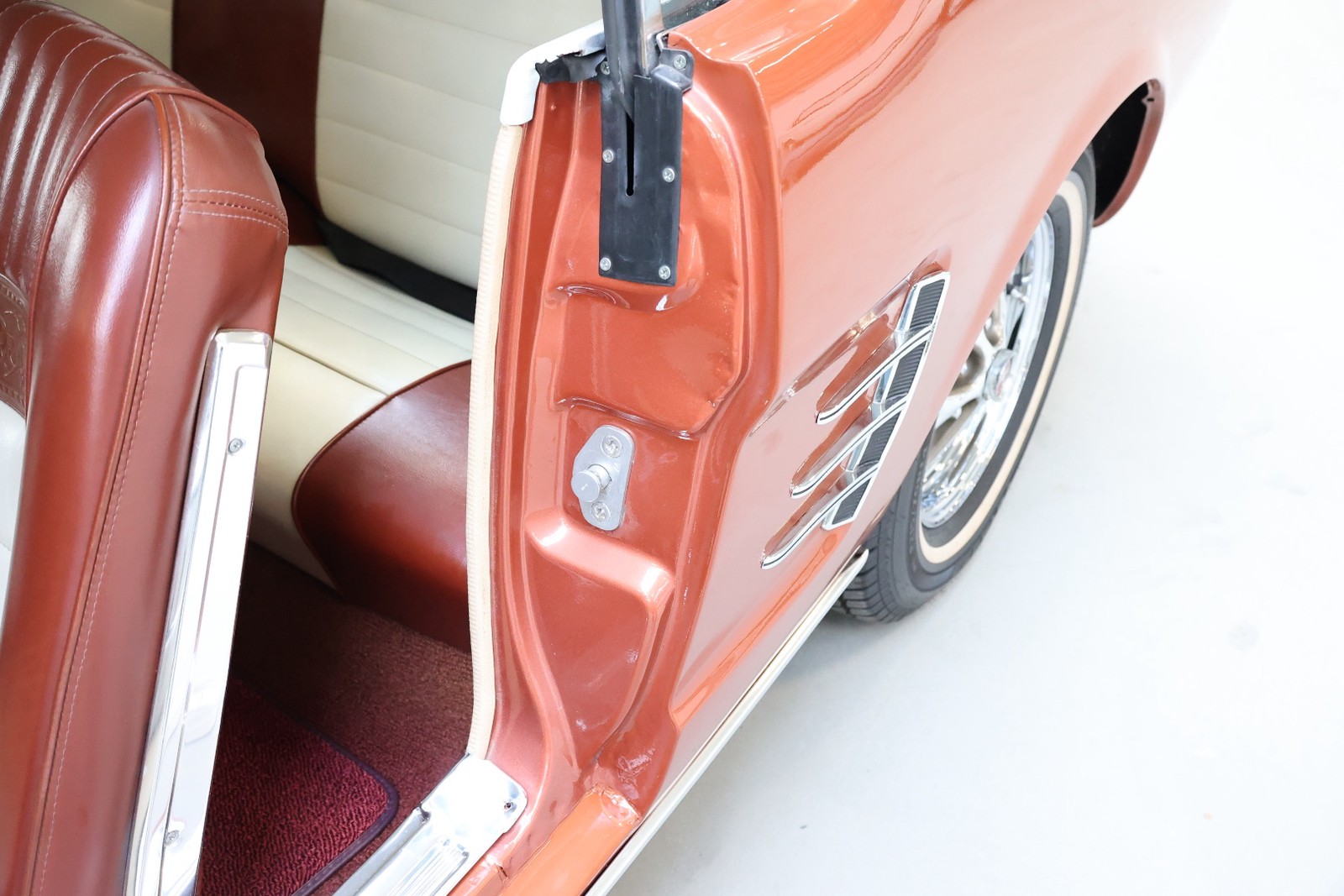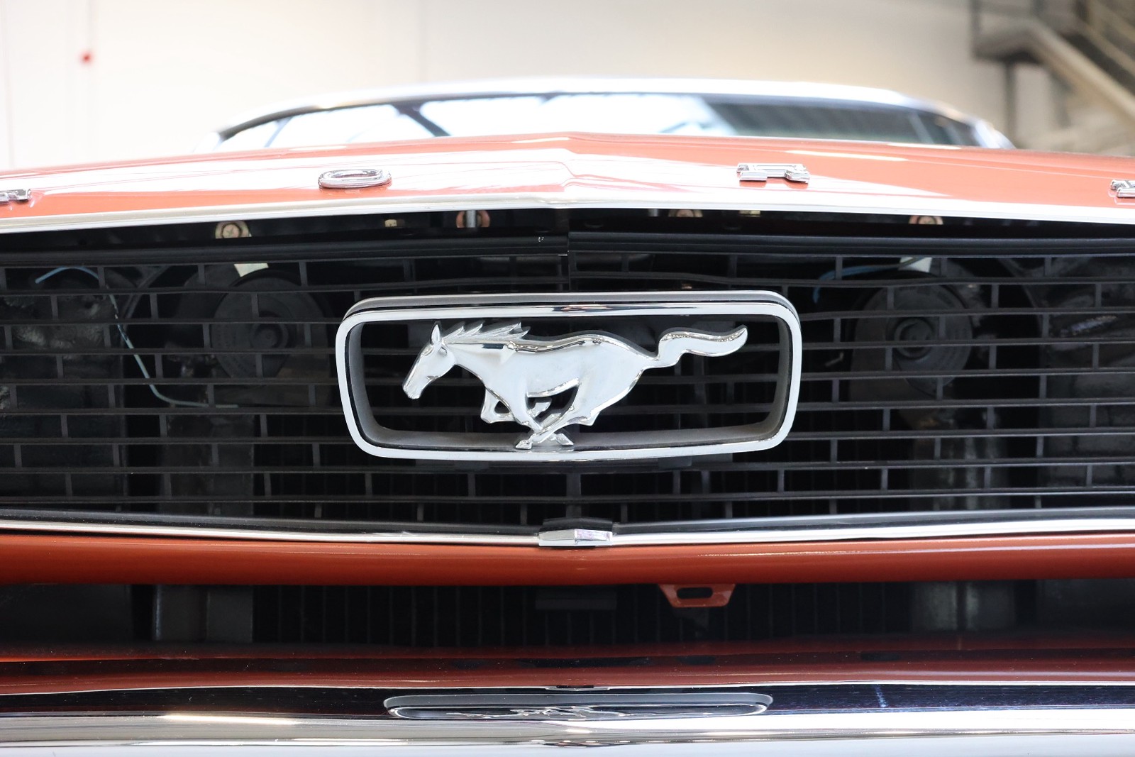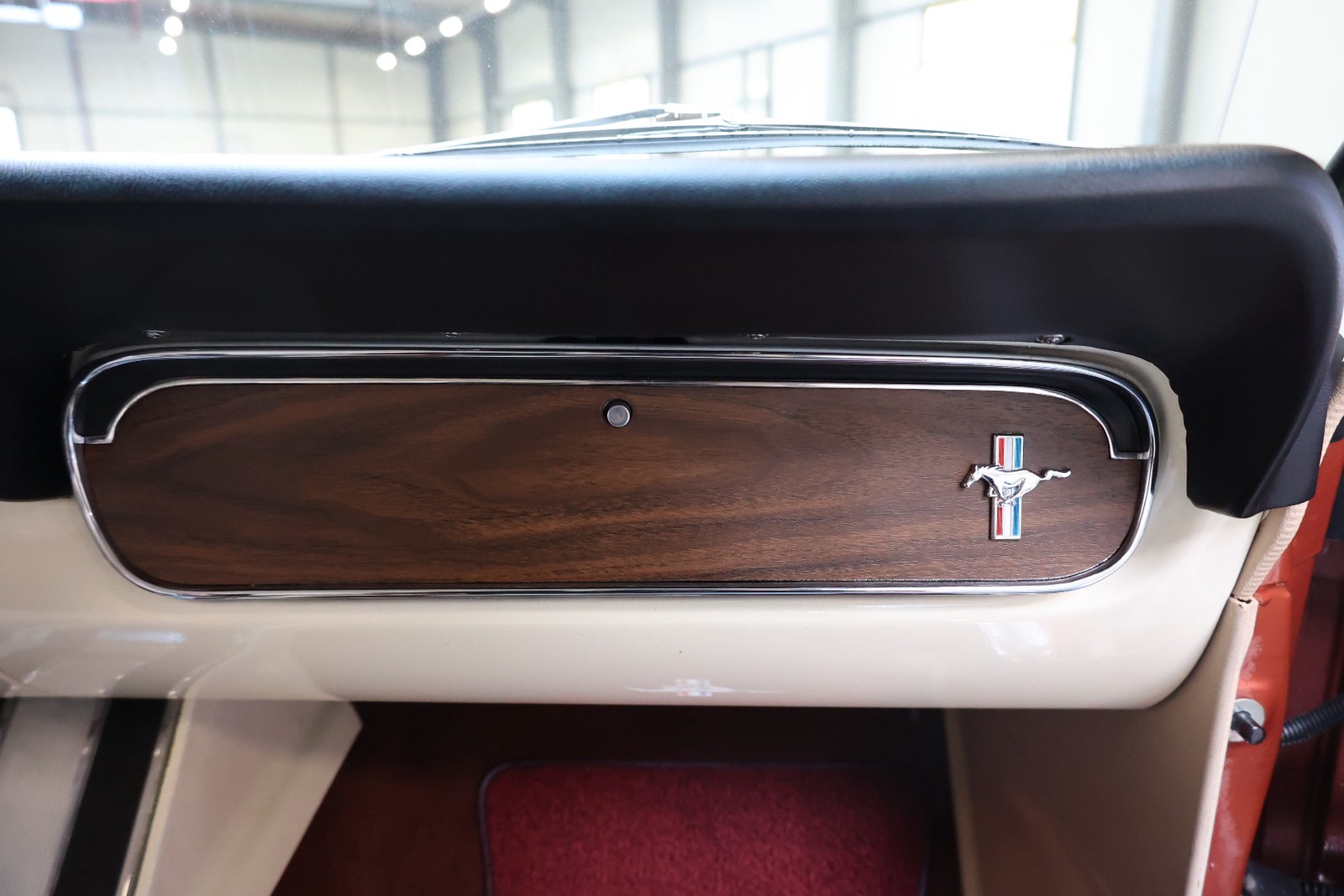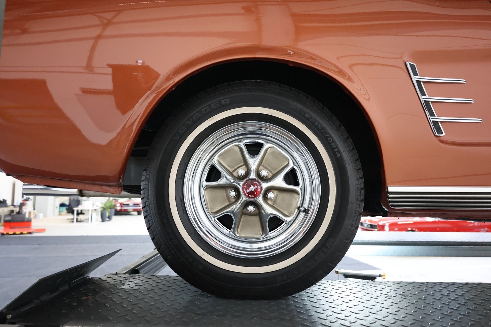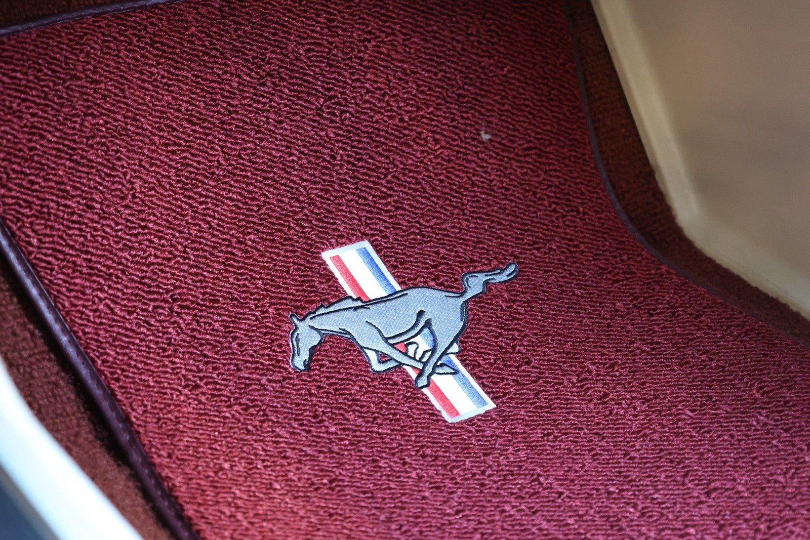Sprechen wir gerne etwas mehr über die Blechbeschaffenheit dieses Ponys. Die Karosserie befindet sich einem sehr schönen und originalen Zustand. Die schöne Lackierung in Emberglow wurde vor etwa 10 Jahren neu gemacht, sie präsentiert sich mit viel Glanz und ist in einem ganz tollen Zustand. Original wurde das Pony in dieser Farbe ausgeliefert, die es auch nur 1966 für den Mustang in dieser Form gab. Oftmals werden Mustangs in anderen Farben umlackiert, schön ist es doch, wenn sich das Auto auch 60 Jahre später immer noch in der gleichen Farbe zeigt. Das schwarze Vinyldach befindet sich ist in einem tadellosen Zustand und weist keinerlei Rostprobleme auf. Die Innenausstattung ist im zweifarbigen Pony-Deluxe Interior gehalten, was sich farblich dem äußeren anschließt und zusätztlich noch in weiss gehalten ist. Also jetzt mal ehrlich, das sieht einfach richtig gut aus und passt mega gut zum Mustang. Auch eine Mittelkonsole sowie ein Holzlenkrad zieren den Innenraum, beides macht sich sehr gut und wird gerne gesehen. Zudem haben wir dem Pony einen neuen Dachhimmel spendiert.