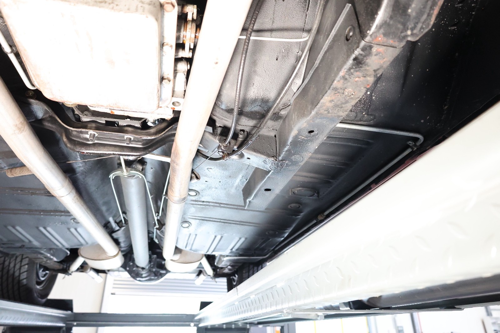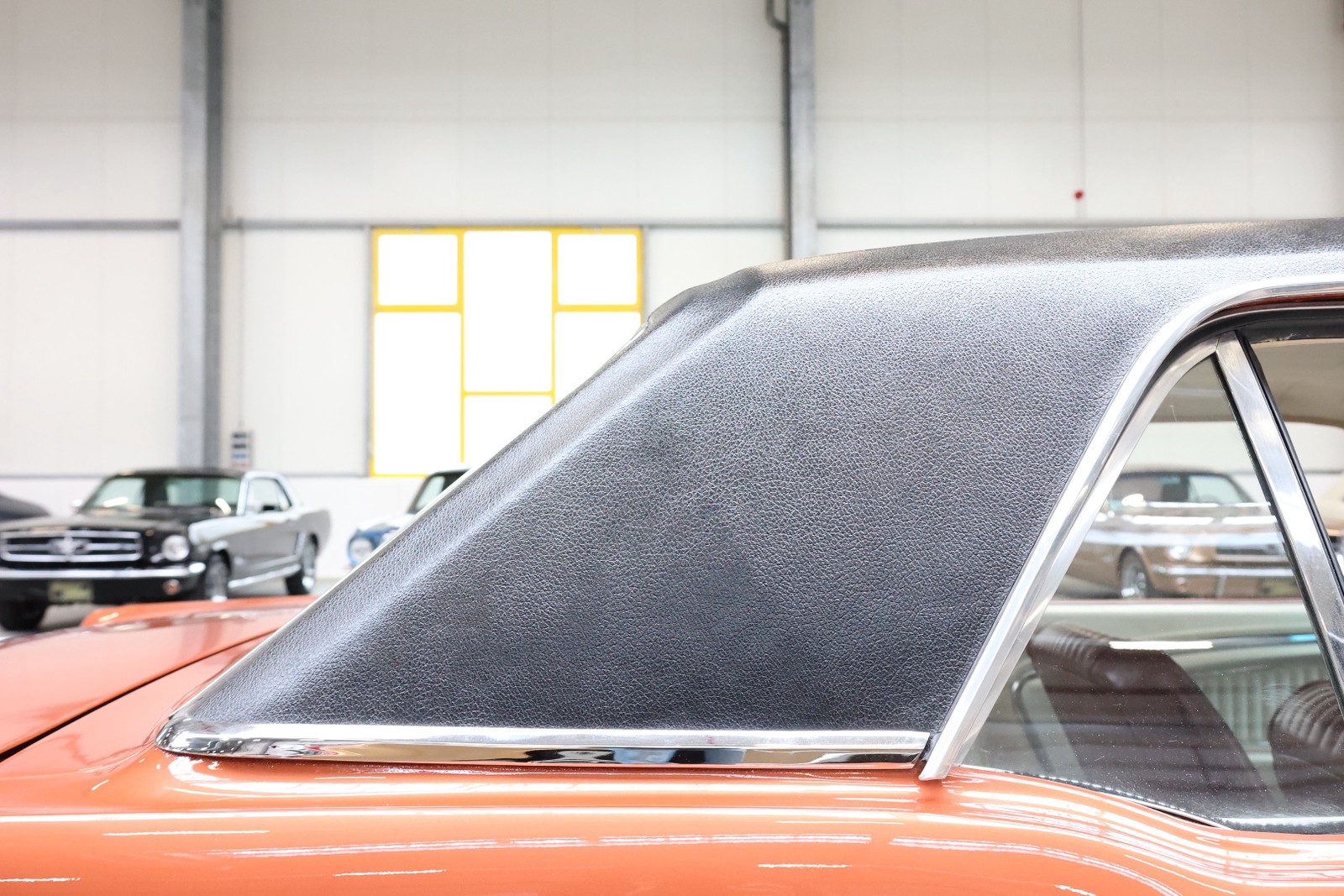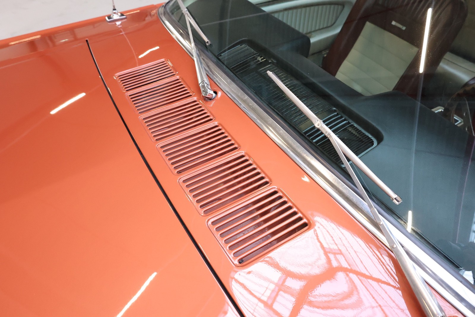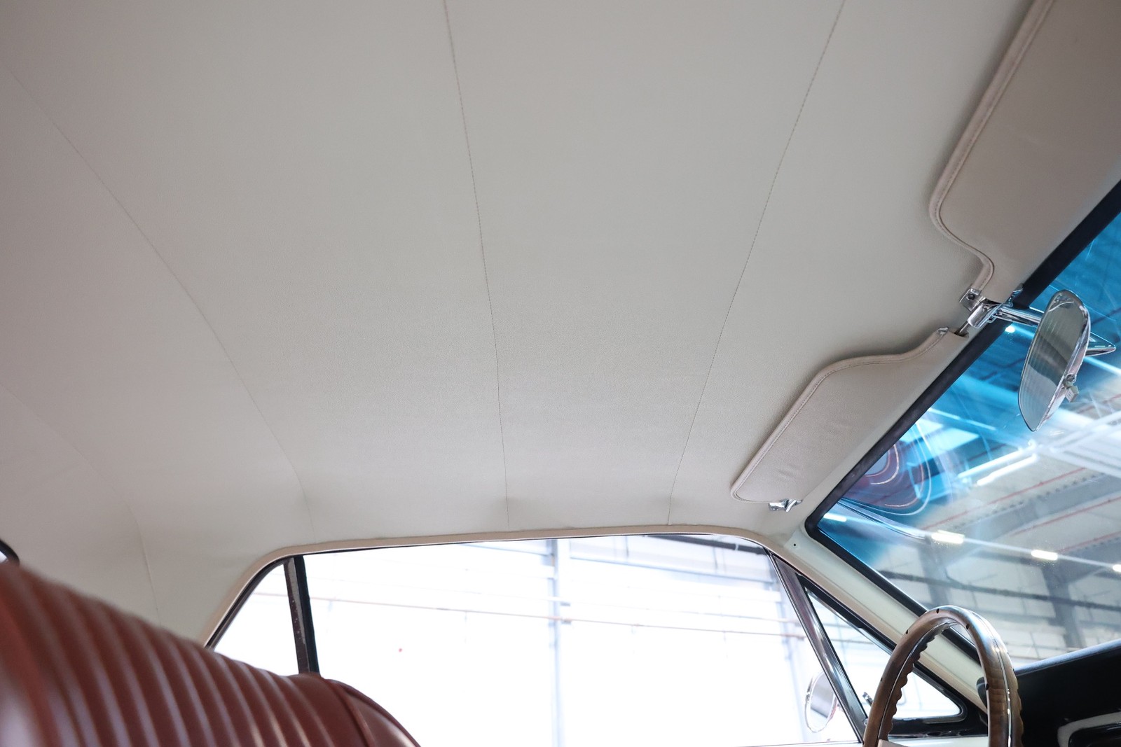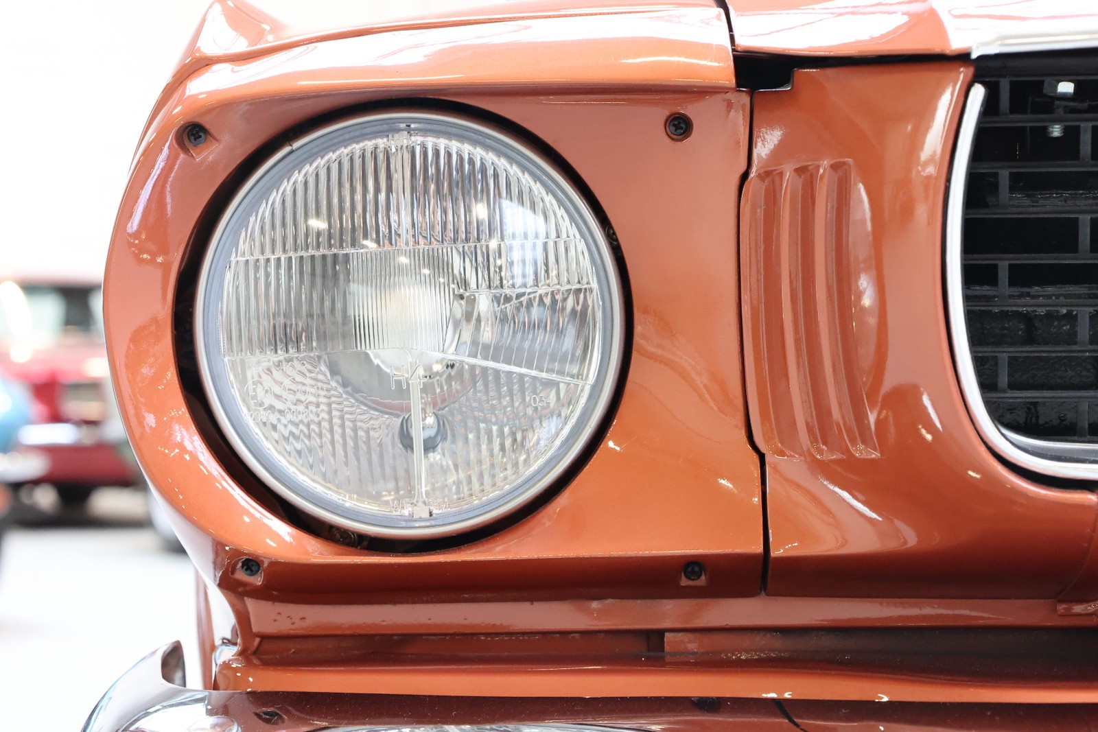 Sprechen wir gerne etwas mehr über die Blechbeschaffenheit dieses Ponys. Die Karosserie befindet sich einem sehr schönen und originalen Zustand. Die schöne Lackierung in Emberglow wurde vor etwa 10 Jahren neu gemacht, sie präsentiert sich mit viel Glanz und ist in einem ganz tollen Zustand. Original wurde das Pony in dieser Farbe ausgeliefert, die es auch nur 1966 für den Mustang in dieser Form gab. Oftmals werden Mustangs in anderen Farben umlackiert, schön ist es doch, wenn sich das Auto auch 60 Jahre später immer noch in der gleichen Farbe zeigt. Das schwarze Vinyldach befindet sich ist in einem tadellosen Zustand und weist keinerlei Rostprobleme auf. Die Innenausstattung ist im zweifarbigen Pony-Deluxe Interior gehalten, was sich farblich dem äußeren anschließt und zusätztlich noch in weiss gehalten ist. Also jetzt mal ehrlich, das sieht einfach richtig gut aus und passt mega gut zum Mustang. Auch eine Mittelkonsole sowie ein Holzlenkrad zieren den Innenraum, beides macht sich sehr gut und wird gerne gesehen. Zudem haben wir dem Pony einen neuen Dachhimmel spendiert.