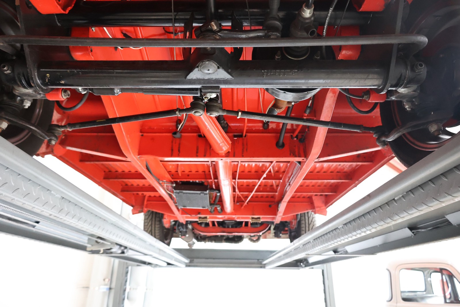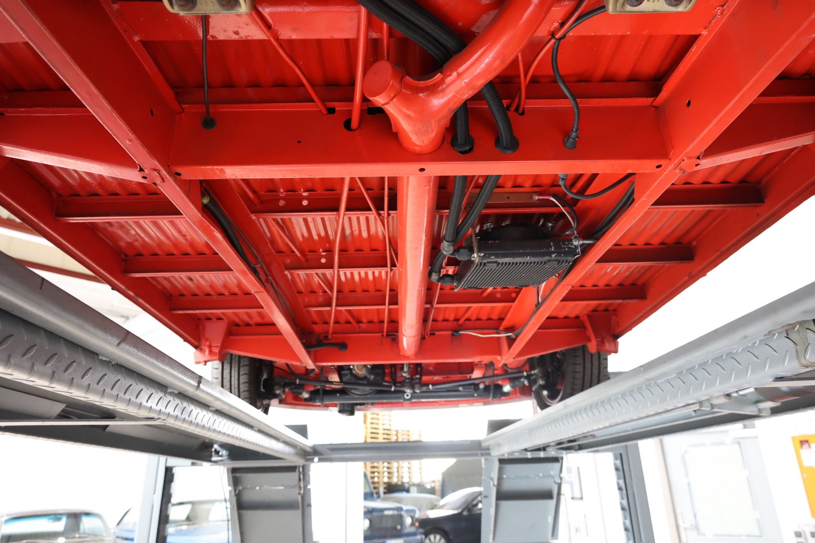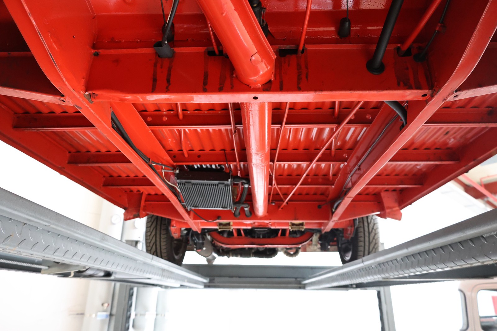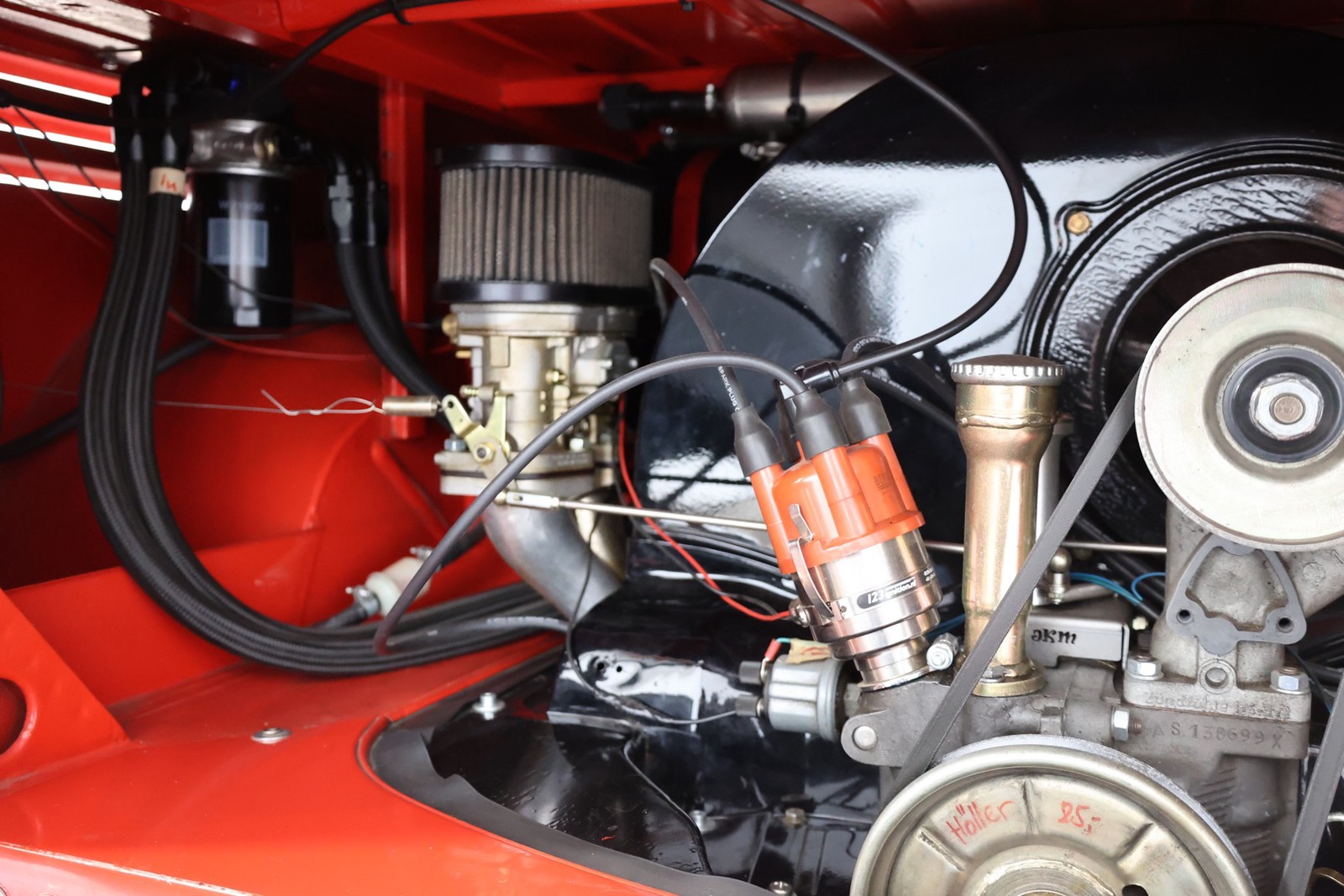 Die gesamte Technik wurde mit Verstand aufgewertet. Ein stärkerer Motor mit 122 PS, 40er Weber Vergaser und größerer Ölkühlanlage inkl. Zusatzgebläse sowie einer 38er CSP Python Abgasanlage wurden verbaut. Der Motor läuft perfekt und produziert wahnsinnig gute Leistung, ein Leistungsdiagramm ist vorhanden, die Leistung lässt sich nachweisen. Für die sichere Verzögerung sorgt eine Porsche 944 Bremsanlage mit 4-Kolben Wilwood Sätteln inklusive Bremskraftverstärker. Aufgrund der Tieferlegung wurde eine 3 Zoll gekürzte Dog Bag Vorderachse, die zusätzlich noch verstärkt ist, verbaut. Fuchs Replica Felgen (eingetragen mit Tüv) stehen dem T1 mehr also gut, eine bessere Wahl kann kaum getroffen werden. Der Wilwood Bremssattel, welcher durch die Felgen zu sehen ist, lässt in Verbindung mit den Felgen drauf schließen, dass es sich nicht um eine Originalkonfiguration handelt, es sich wahrscheinlich um einen Sleeper handelt, ein unauffälliges Auto also, was aber richtig viel Power hat. Na ja, unauffällig ist ein T1 jetzt gerade nicht, allerdings wird es nur wenige geben, die optimierte Performance Technik verbaut haben, schon garnicht ein ehemaliges Feuerwehrfahrzeug.