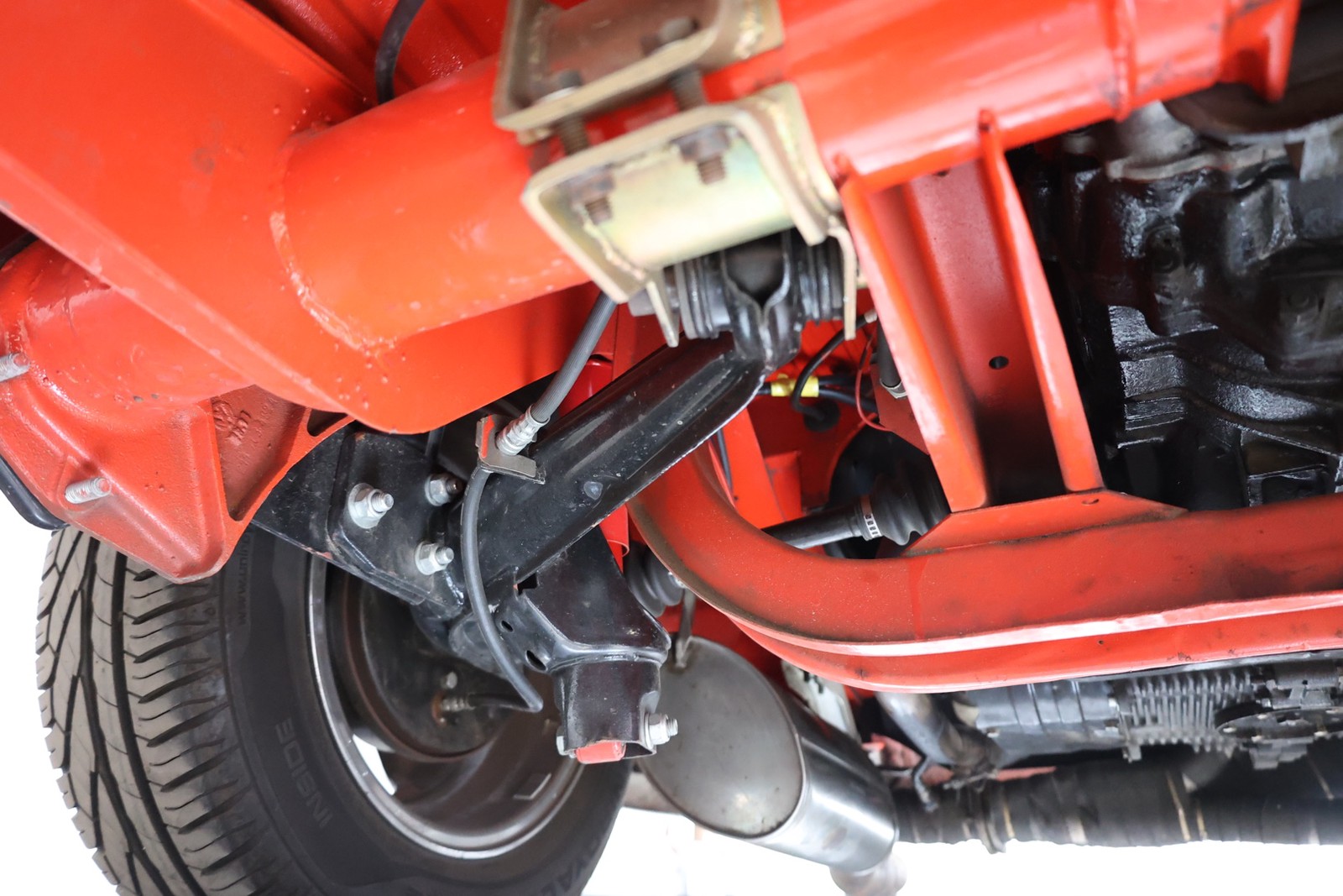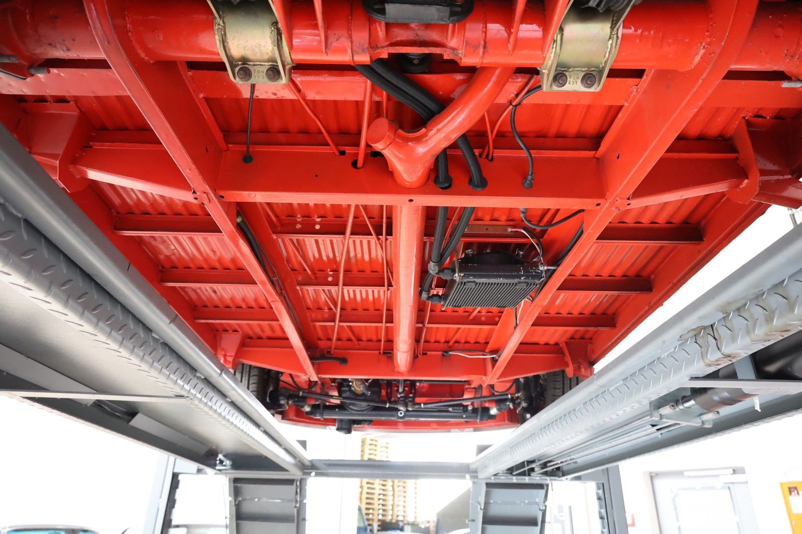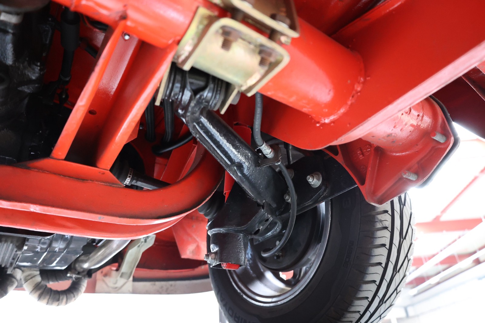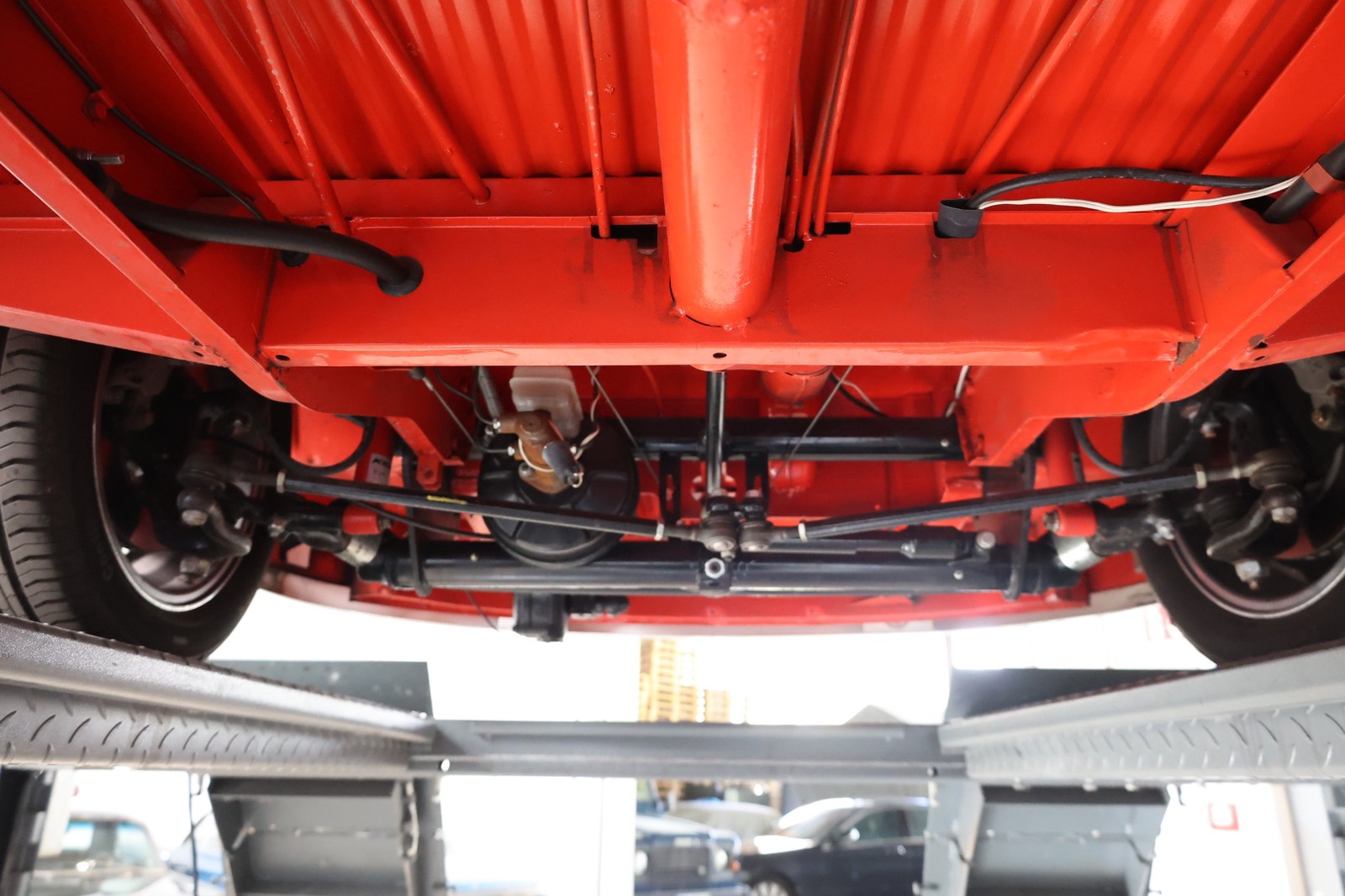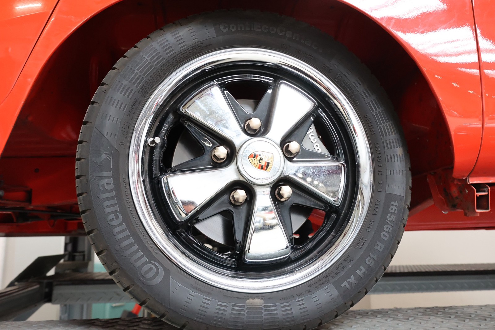 Die gesamte Technik wurde mit Verstand aufgewertet. Ein stärkerer Motor mit 122 PS, 40er Weber Vergaser und größerer Ölkühlanlage inkl. Zusatzgebläse sowie einer 38er CSP Python Abgasanlage wurden verbaut. Der Motor läuft perfekt und produziert wahnsinnig gute Leistung, ein Leistungsdiagramm ist vorhanden, die Leistung lässt sich nachweisen. Für die sichere Verzögerung sorgt eine Porsche 944 Bremsanlage mit 4-Kolben Wilwood Sätteln inklusive Bremskraftverstärker. Aufgrund der Tieferlegung wurde eine 3 Zoll gekürzte Dog Bag Vorderachse, die zusätzlich noch verstärkt ist, verbaut. Fuchs Replica Felgen (eingetragen mit Tüv) stehen dem T1 mehr also gut, eine bessere Wahl kann kaum getroffen werden. Der Wilwood Bremssattel, welcher durch die Felgen zu sehen ist, lässt in Verbindung mit den Felgen drauf schließen, dass es sich nicht um eine Originalkonfiguration handelt, es sich wahrscheinlich um einen Sleeper handelt, ein unauffälliges Auto also, was aber richtig viel Power hat. Na ja, unauffällig ist ein T1 jetzt gerade nicht, allerdings wird es nur wenige geben, die optimierte Performance Technik verbaut haben, schon garnicht ein ehemaliges Feuerwehrfahrzeug.