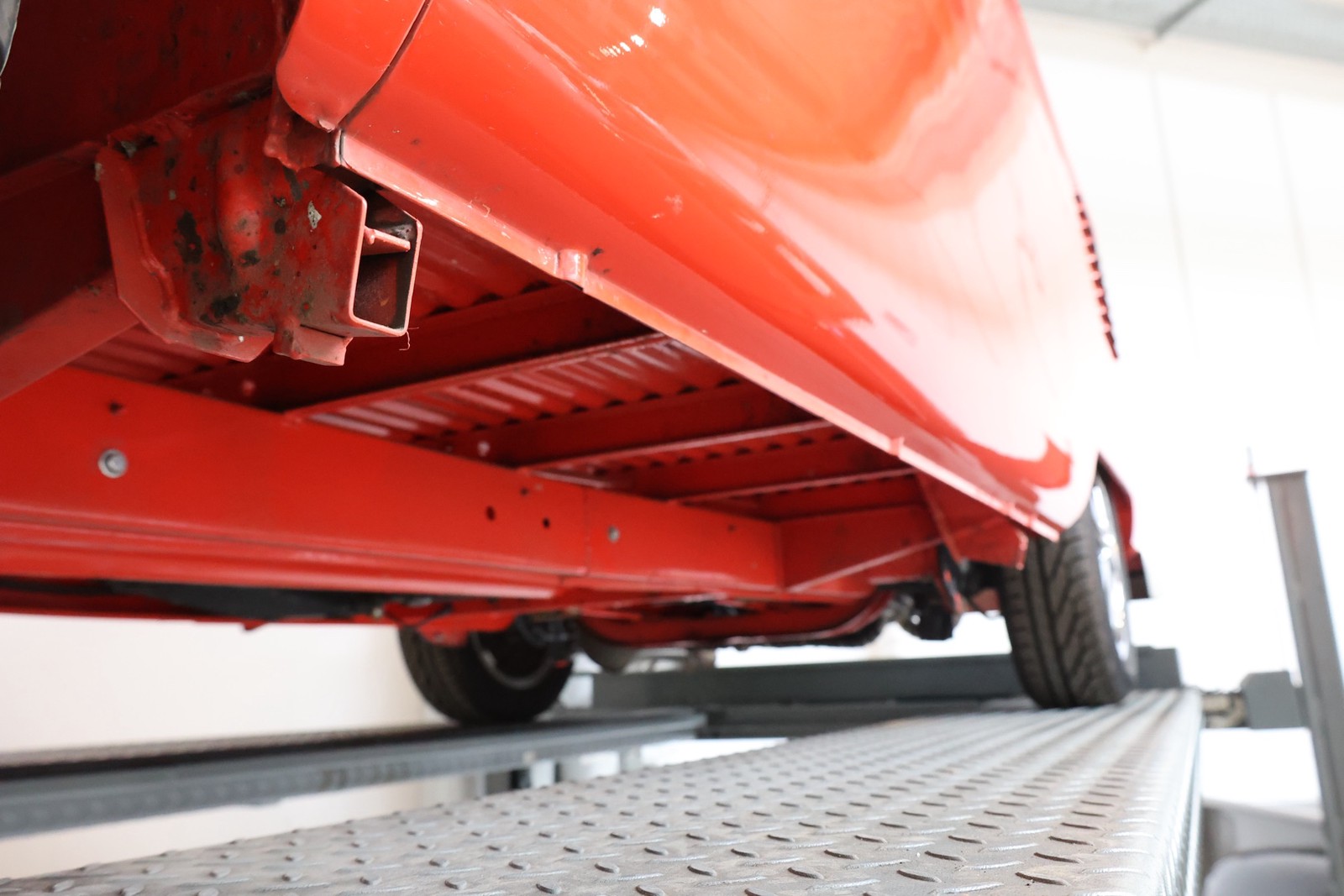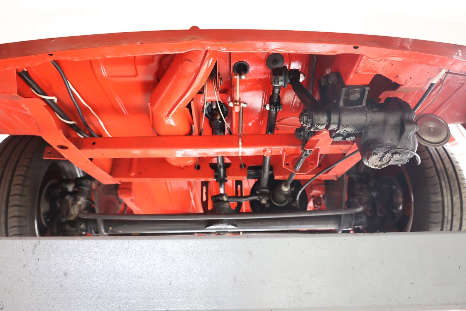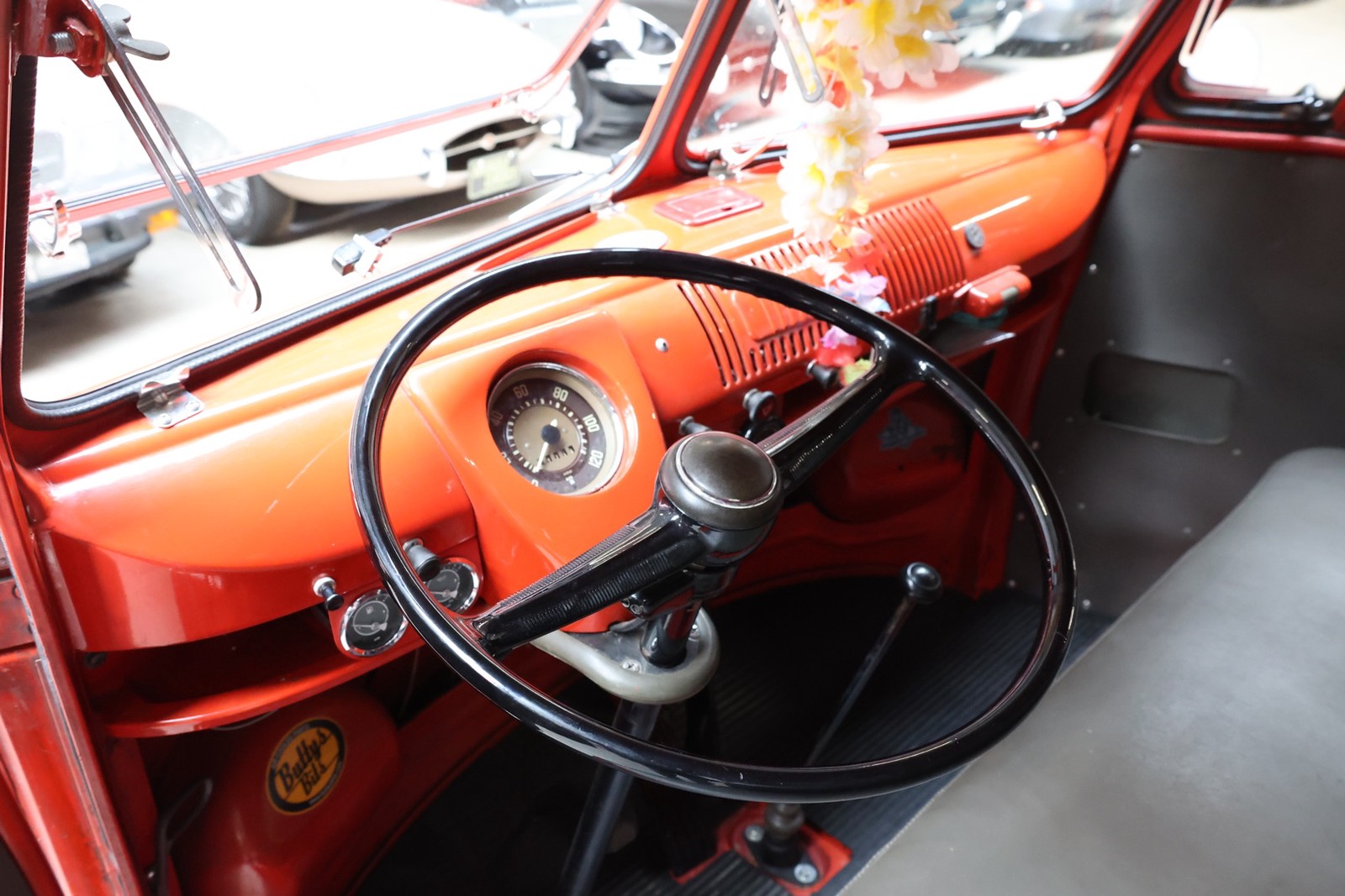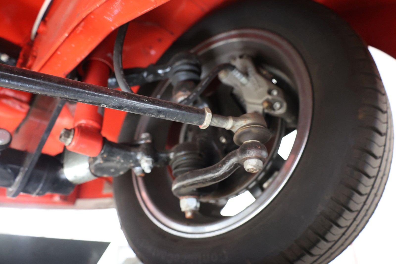 Die gesamte Technik wurde mit Verstand aufgewertet. Ein stärkerer Motor mit 122 PS, 40er Weber Vergaser und größerer Ölkühlanlage inkl. Zusatzgebläse sowie einer 38er CSP Python Abgasanlage wurden verbaut. Der Motor läuft perfekt und produziert wahnsinnig gute Leistung, ein Leistungsdiagramm ist vorhanden, die Leistung lässt sich nachweisen. Für die sichere Verzögerung sorgt eine Porsche 944 Bremsanlage mit 4-Kolben Wilwood Sätteln inklusive Bremskraftverstärker. Aufgrund der Tieferlegung wurde eine 3 Zoll gekürzte Dog Bag Vorderachse, die zusätzlich noch verstärkt ist, verbaut. Fuchs Replica Felgen (eingetragen mit Tüv) stehen dem T1 mehr also gut, eine bessere Wahl kann kaum getroffen werden. Der Wilwood Bremssattel, welcher durch die Felgen zu sehen ist, lässt in Verbindung mit den Felgen drauf schließen, dass es sich nicht um eine Originalkonfiguration handelt, es sich wahrscheinlich um einen Sleeper handelt, ein unauffälliges Auto also, was aber richtig viel Power hat. Na ja, unauffällig ist ein T1 jetzt gerade nicht, allerdings wird es nur wenige geben, die optimierte Performance Technik verbaut haben, schon garnicht ein ehemaliges Feuerwehrfahrzeug.