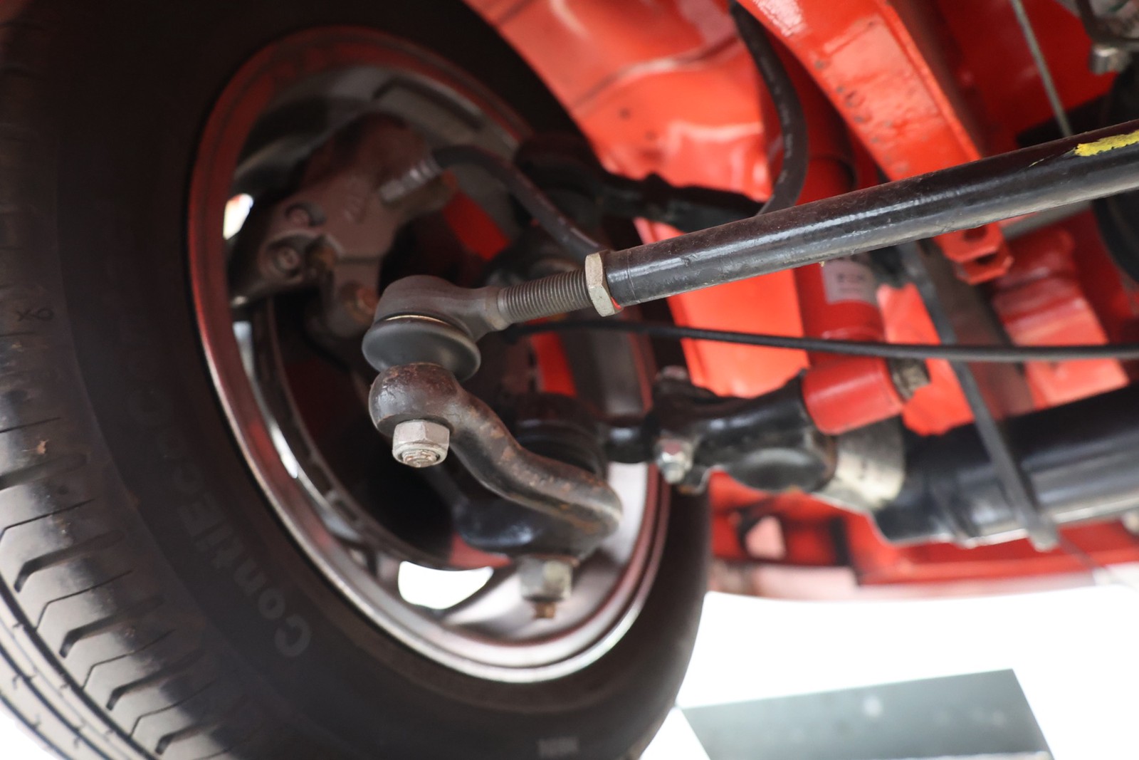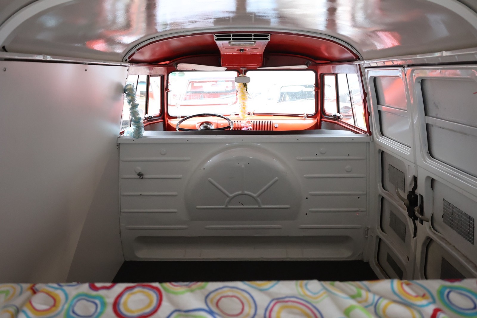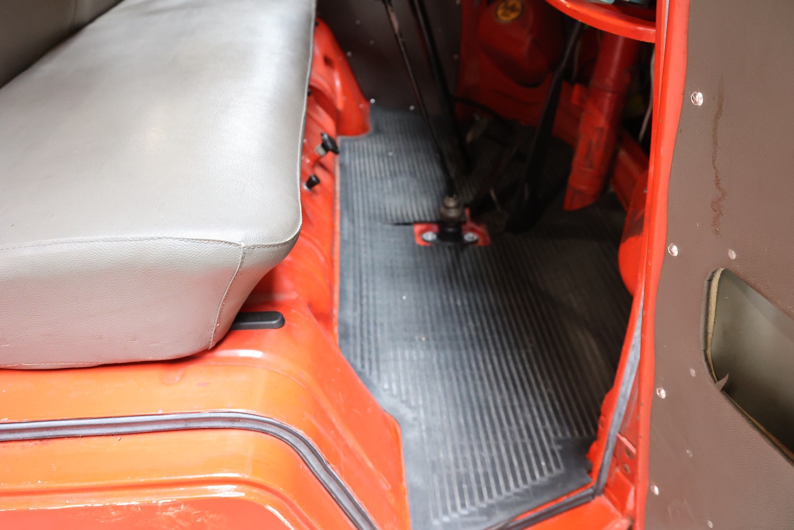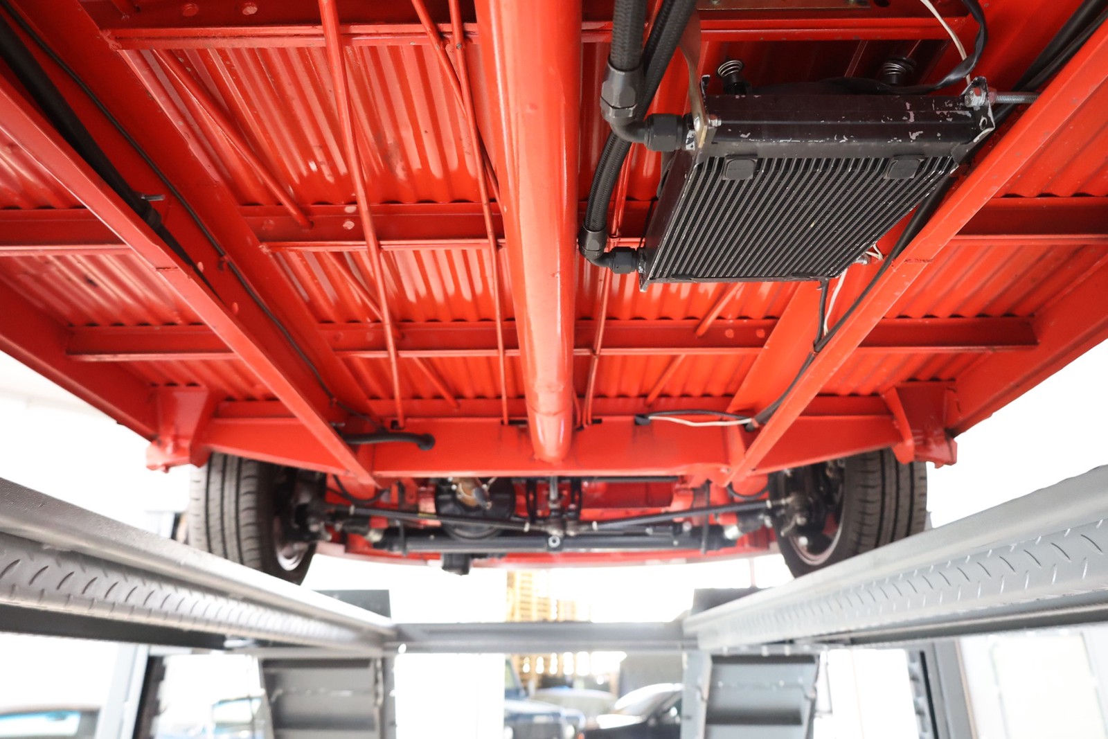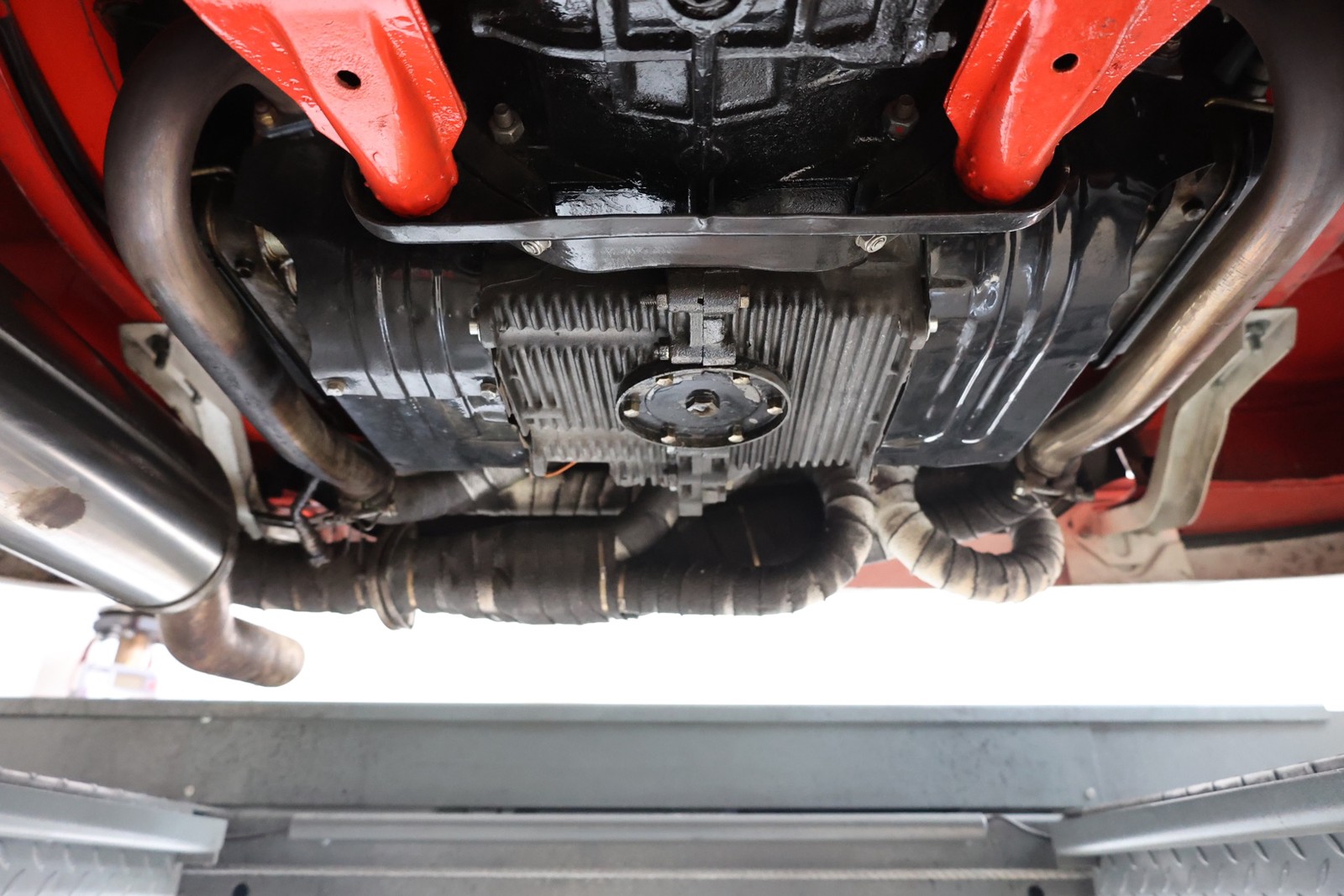 Die gesamte Technik wurde mit Verstand aufgewertet. Ein stärkerer Motor mit 122 PS, 40er Weber Vergaser und größerer Ölkühlanlage inkl. Zusatzgebläse sowie einer 38er CSP Python Abgasanlage wurden verbaut. Der Motor läuft perfekt und produziert wahnsinnig gute Leistung, ein Leistungsdiagramm ist vorhanden, die Leistung lässt sich nachweisen. Für die sichere Verzögerung sorgt eine Porsche 944 Bremsanlage mit 4-Kolben Wilwood Sätteln inklusive Bremskraftverstärker. Aufgrund der Tieferlegung wurde eine 3 Zoll gekürzte Dog Bag Vorderachse, die zusätzlich noch verstärkt ist, verbaut. Fuchs Replica Felgen (eingetragen mit Tüv) stehen dem T1 mehr also gut, eine bessere Wahl kann kaum getroffen werden. Der Wilwood Bremssattel, welcher durch die Felgen zu sehen ist, lässt in Verbindung mit den Felgen drauf schließen, dass es sich nicht um eine Originalkonfiguration handelt, es sich wahrscheinlich um einen Sleeper handelt, ein unauffälliges Auto also, was aber richtig viel Power hat. Na ja, unauffällig ist ein T1 jetzt gerade nicht, allerdings wird es nur wenige geben, die optimierte Performance Technik verbaut haben, schon garnicht ein ehemaliges Feuerwehrfahrzeug.